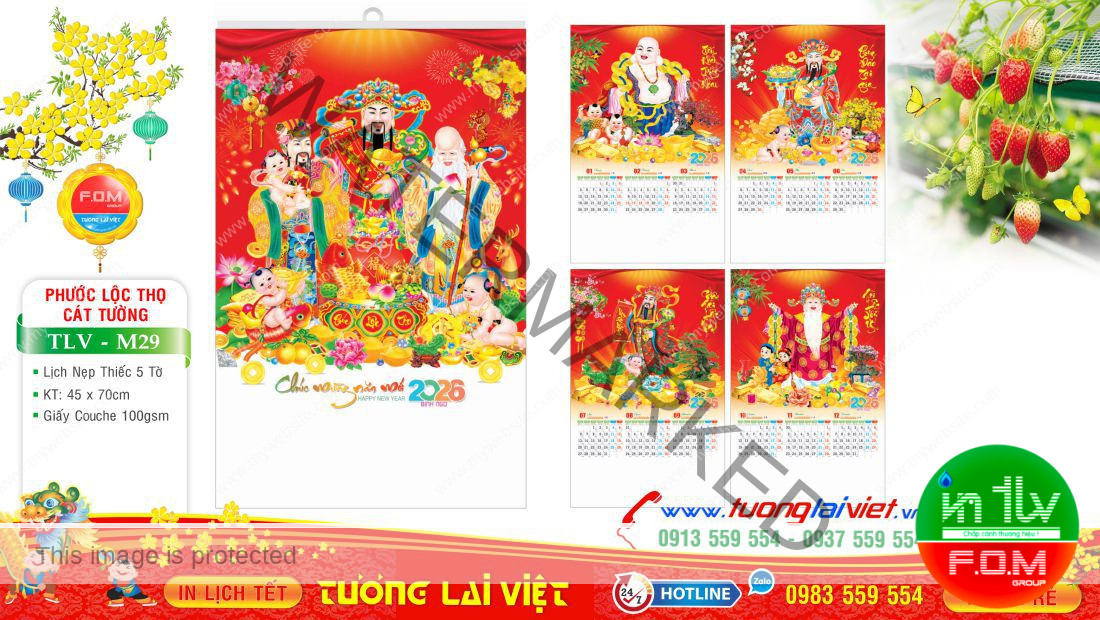 Lịch 5 tờ nẹp thiếc thường được in Offset 1 mặt trên giấy C105gsm, có kích thước: 36×70 và 45x70cm. Lịch 5 tờ Phúc lộc thọ là mẫu lịch tờ treo tường giá rẻ nên được nhiều cửa hàng nhỏ lẻ chọn in lịch tết năm nay để làm quà tặng cuối năm cho khách hàng, bạn bè, đối tác và người thân nhân dịp năm mới.